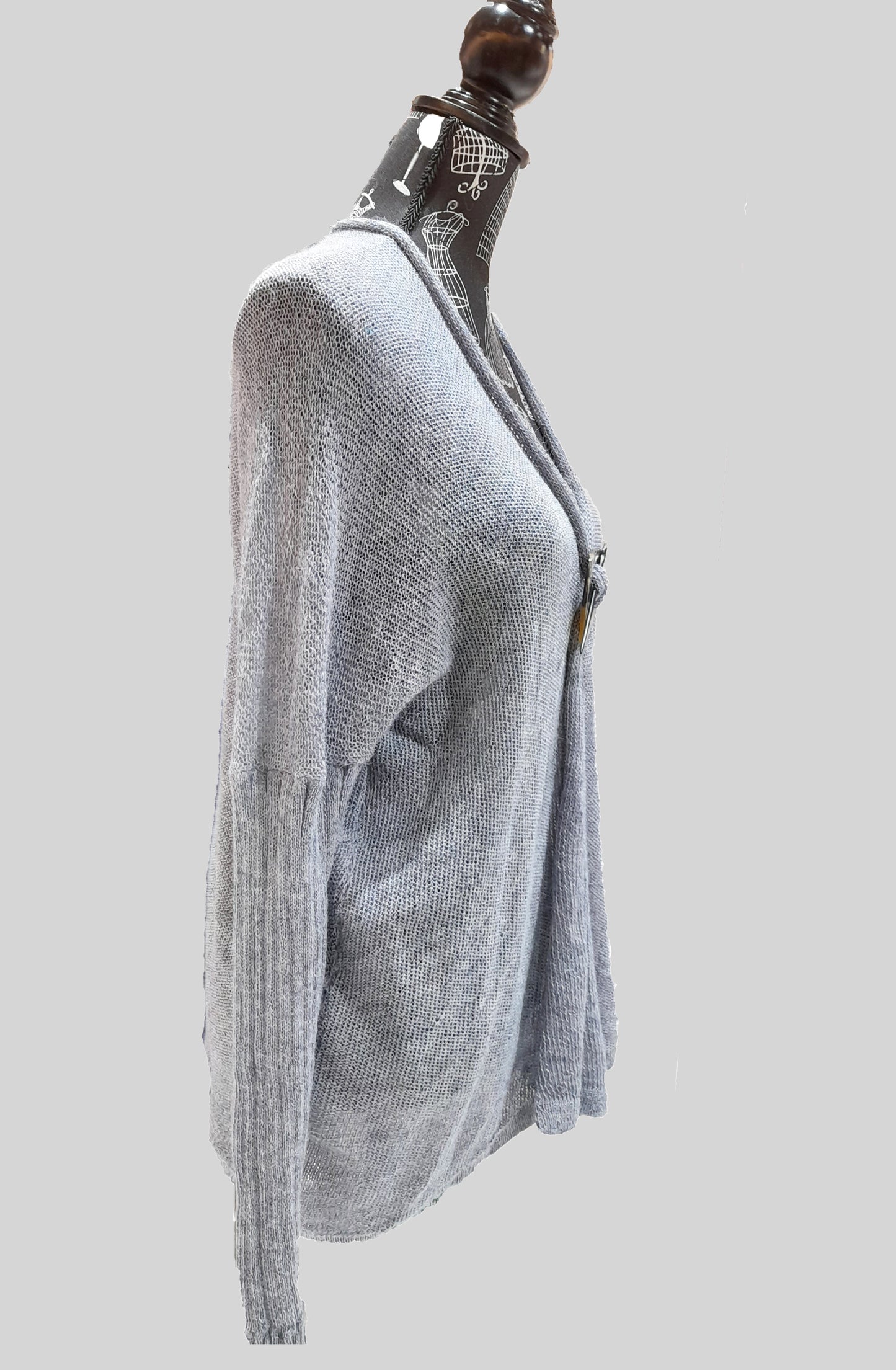 Introducing our open bohemian-style cardigan, exclusive in pale tones suitable for summer climates. It is knitted with a delicate, open jersey stitch in solid colors. It remains open without buttons, draping perfectly in the front. You can add a brooch if you wish. The bohemian style allows you to wear it with a long dress or as a bikini cover-up for the beach. Its long sleeves provide sun protection and make your bikini visible through the cardigan's sheer fabric. The fine blend of baby alpaca and cotton ensures this cardigan doesn't trap heat, making it breathable and exceptionally relaxing