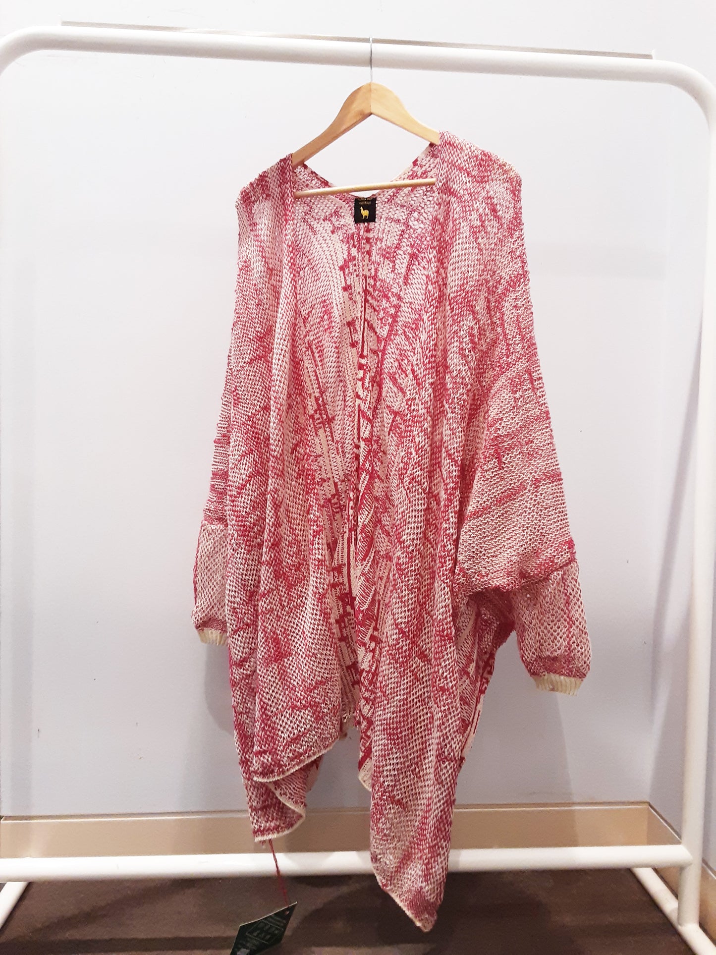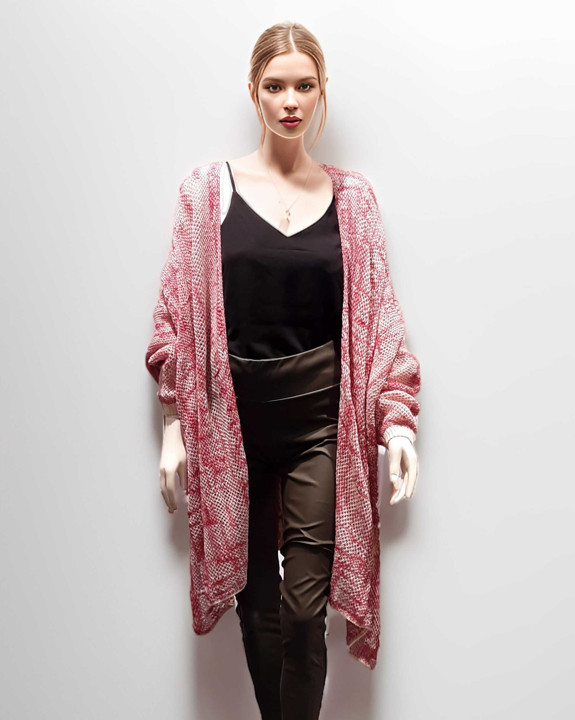 Introducing our open bohemian-style cardigan, exclusive in pale two tones suitable for summer climates. It is knitted with a delicate, open jersey stitch in solid colors. It remains open without buttons, draping perfectly in the front. You can add a brooch if you wish. The bohemian style allows you to wear it with a long dress or as a bikini cover-up for the beach. Its long sleeves provide sun protection and make your bikini visible through the cardigan's sheer fabric. The fine blend of baby alpaca and cotton ensures this cardigan doesn't trap heat, making it breathable and exceptionally relaxing